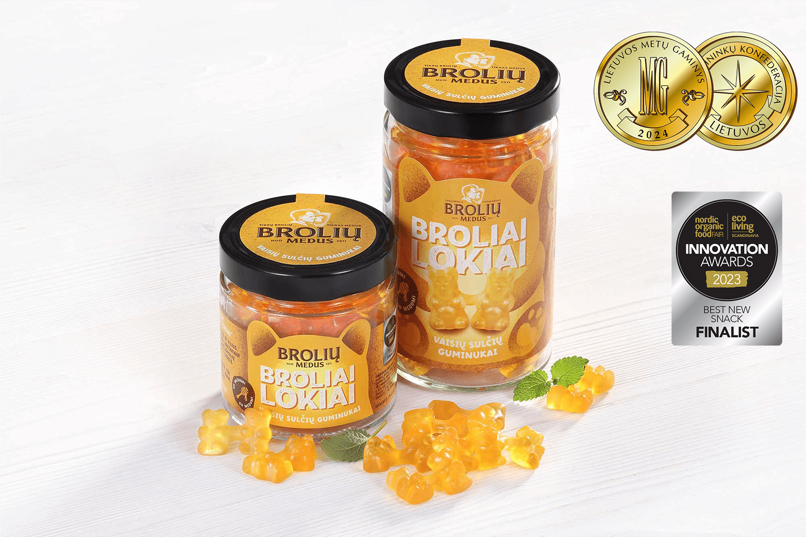 Mēs piedāvājam ne tikai tradicionālo lietuviešu medu un bišu maizi, ziedputekšņi, kakla aerosoli ar piķi, bet arī unikāli produkti, piemēram, medus ar liofilizētām ogām, šokolādes un piena konfektes ar medu. Broliai Bears augļu sulas un medus gumijas ar zelta medaļu kaudzes augšgalā„.