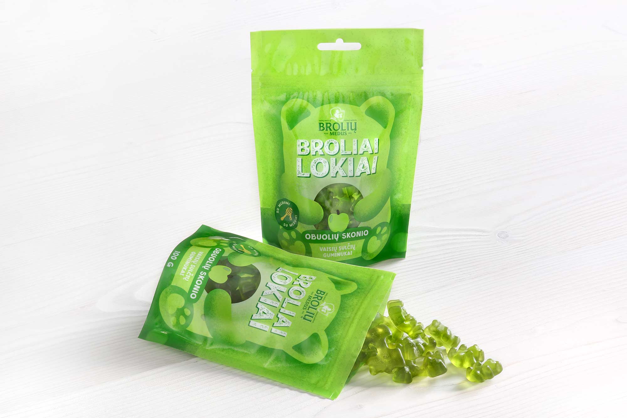 Draudzīgākie gumīši Lietuvā! Vienīgie, kas gatavoti no īsta medus un bagātināti ar vitamīniem. Dabīga garša, maiga tekstūra un jautra forma, lai katrs kumosiņš būtu salds atklājums. Uzmanību! „Brāļi lāči“ - nedroši, bet garšīgi!